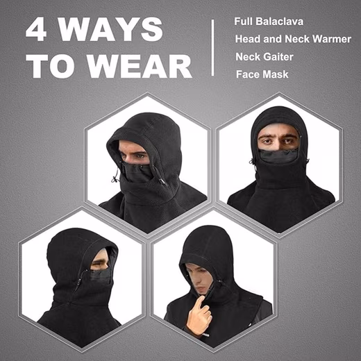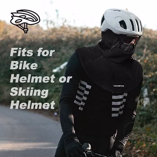 Can be worn as a neck warmer, half mask, or balaclava. Fits motorcycle, ski, and bicycle helmets.