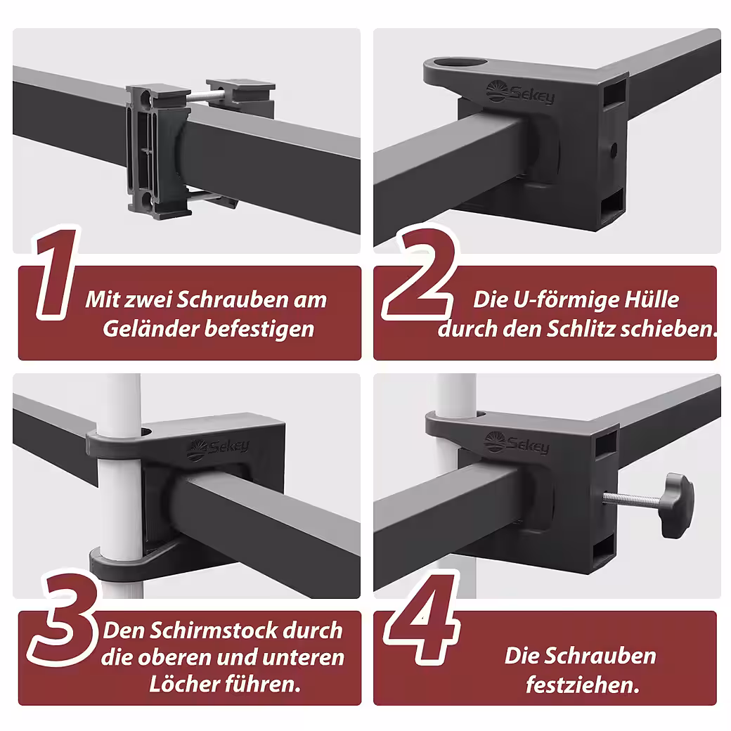 • Easy assembly: Installation is simple with the included stainless steel screws. Attaching the parasol to the balcony railing takes only about 3-5 minutes.