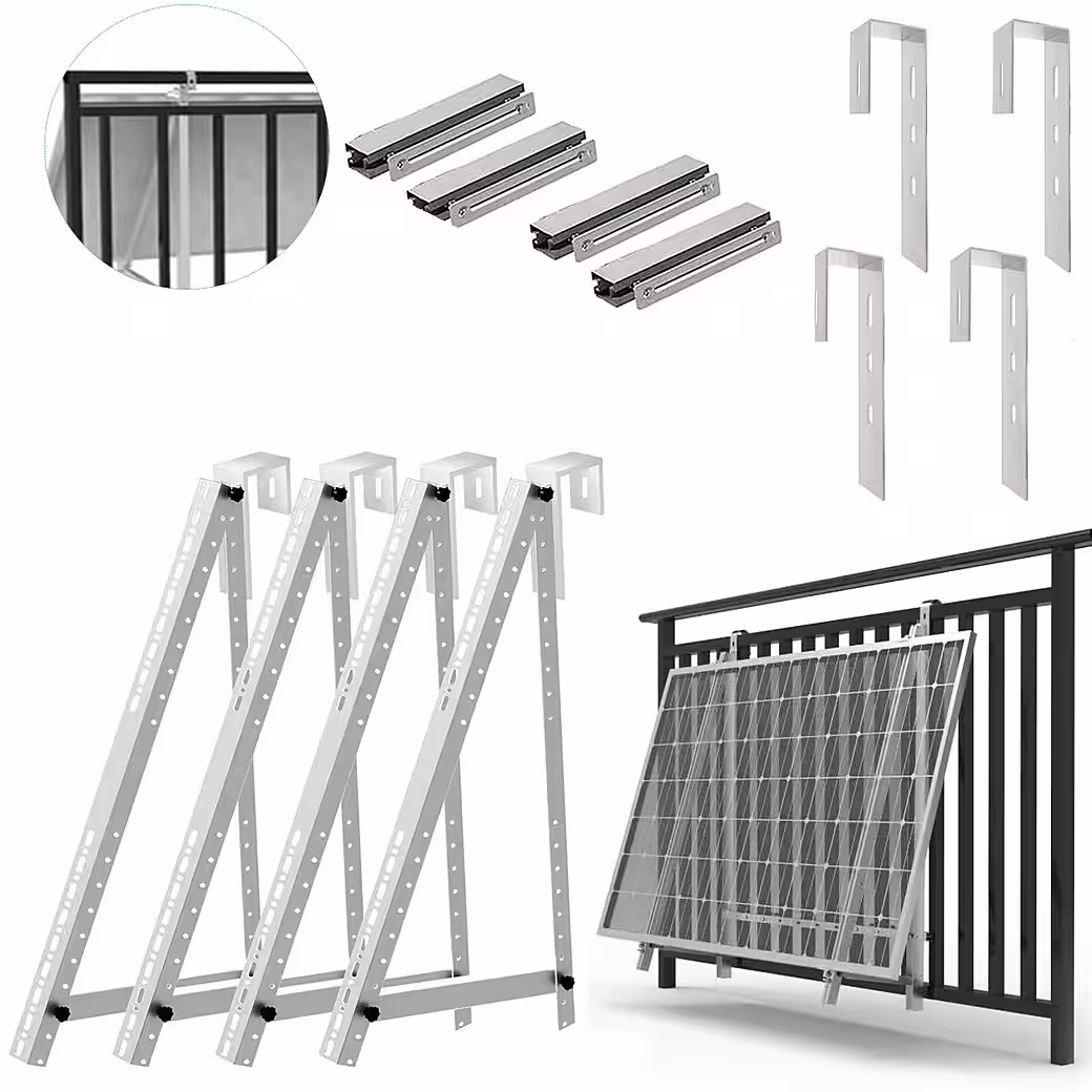 This solar panel mounting bracket with a square balcony hook offers a stable and adaptable solution for installing PV panels on balconies, roofs, or terraces. The adjustable aluminum frame allows for optimal alignment with the sun, while the corner-optimized hook ensures secure attachment to metal or wooden railings – without drilling or damage.