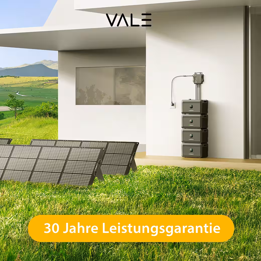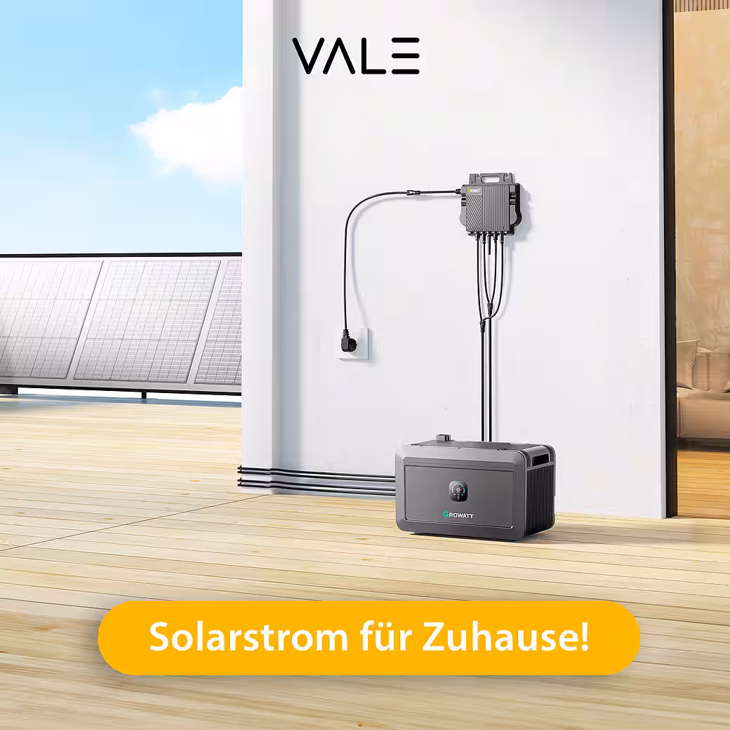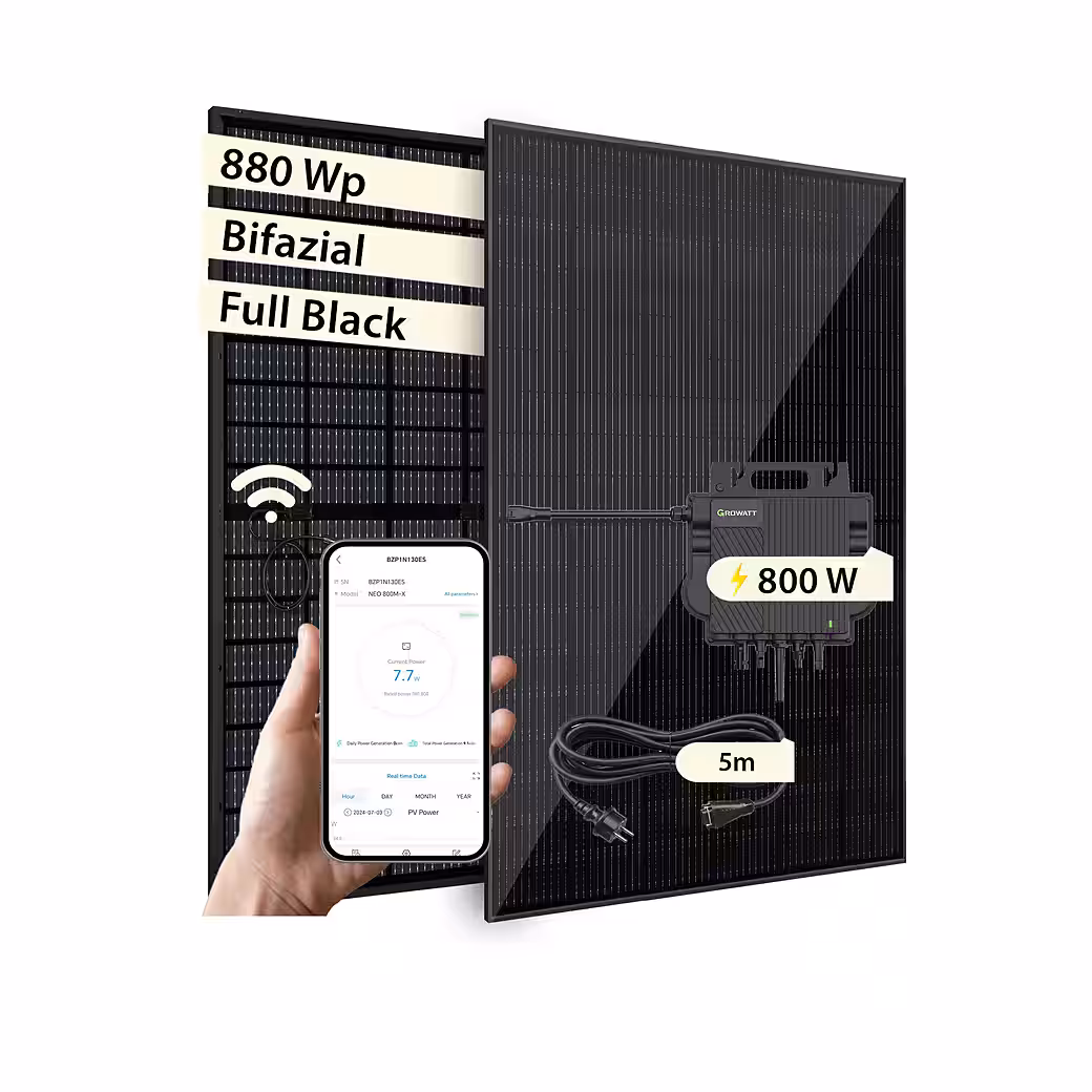 Start your independent energy supply now – with the high-quality VALE balcony power plant complete set. This set combines two bifacial premium solar modules (440, 445, 450 or 460 Wp each, full black, glass-glass, N-type) with the powerful Growatt Neo 800M-X micro-inverter and a user-friendly plug-and-play system for easy installation on balconies, terraces or in the garden.