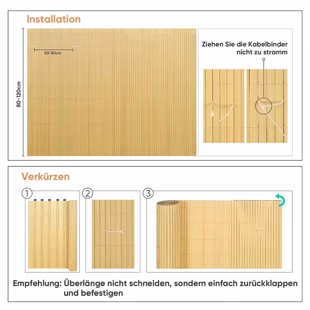 If the privacy screen is too long, we recommend folding the excess length and attaching it to the railing instead of shortening it . This way, the appearance is not affected, and the privacy screen is effectively doubled. Since all PVC privacy screen mats on the market are manufactured with adhesive joints, cutting them to size requires some skill, and the process could go wrong if the steps are not followed precisely!