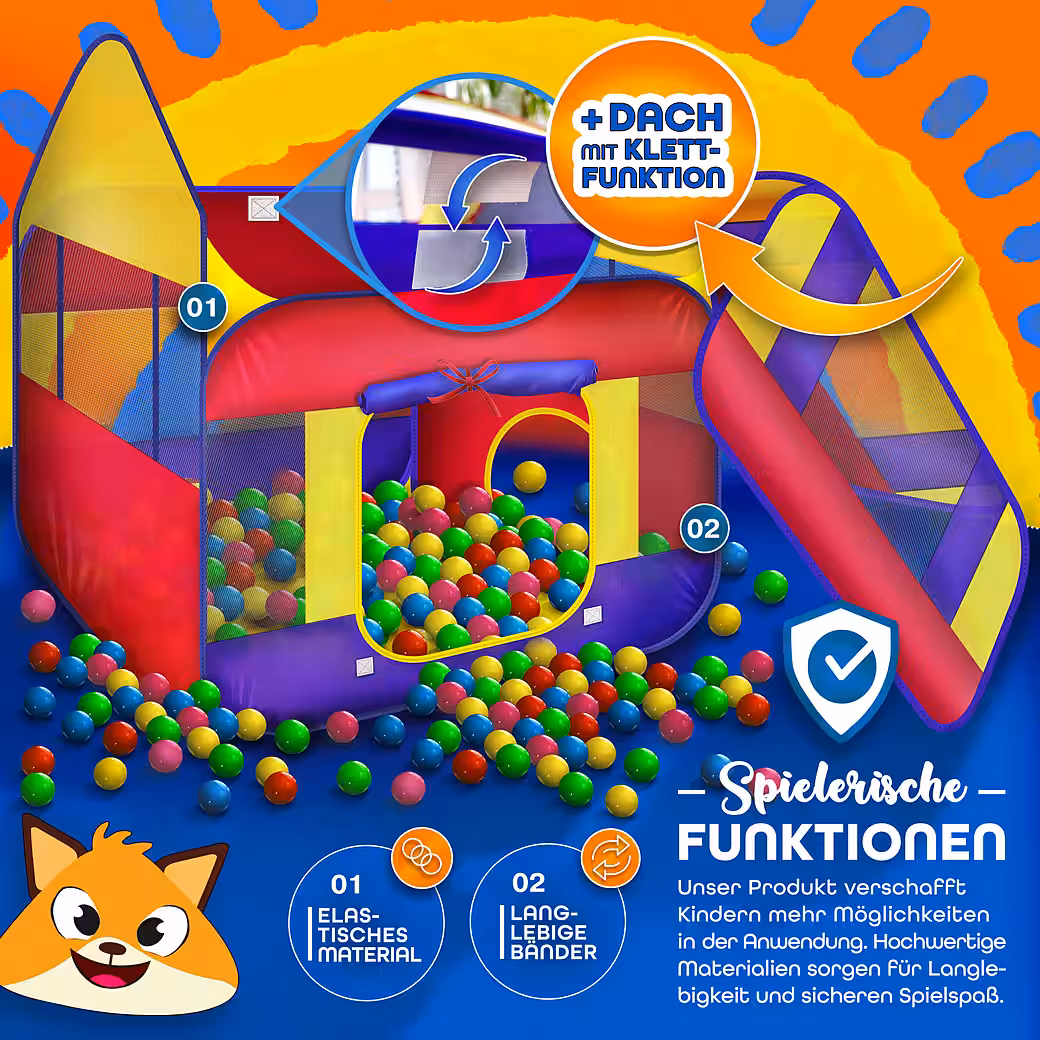 • Ideal protection with water-repellent tent fabric. Super quick assembly by unfolding the elements. The tent roof is removable Round shapes and fun colors