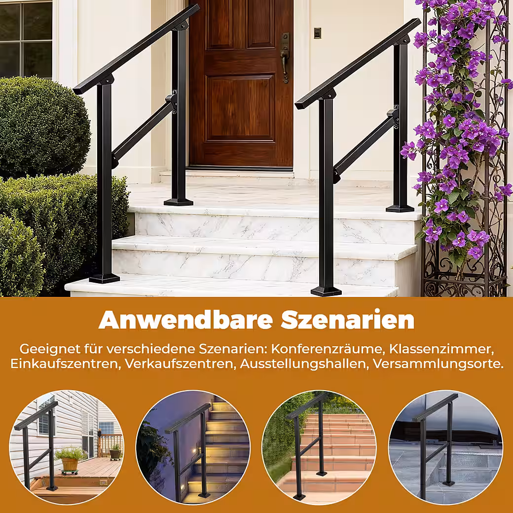 • Angle adjustable: This handrail can be easily adjusted to angles from 0-48° to accommodate different step heights without having to change the rail. These step rails are not only suitable for vertical 2-3 step staircases, but can also be installed on horizontal ground to serve as a railing. NOTE: When installed on vertical steps, the maximum height difference between steps is 18.5 inches (47 cm), with a minimum distance of 19.3 inches (49 cm) between the two posts.
