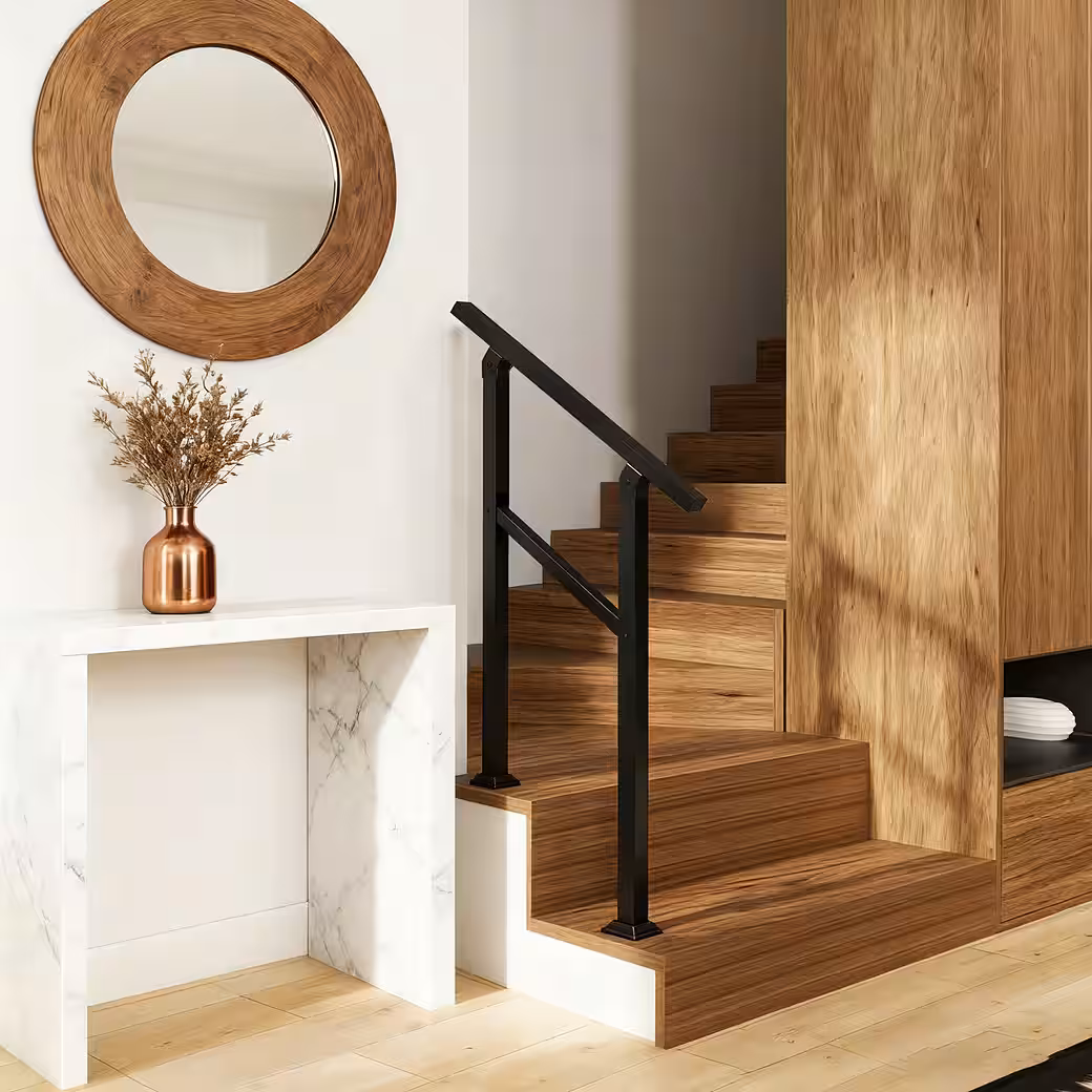 • Robust and durable handrail: Unlike some aluminum handrails, this stair railing is made of high-quality galvanized steel, ensuring stability and durability and withstanding various outdoor weather conditions such as rain, snow, and sun exposure. The black, matte powder coating on the handrail’s surface not only provides a firm grip for the user, even in wet conditions, but also protects the metal and offers high resistance to rust, scratches, and fading.
