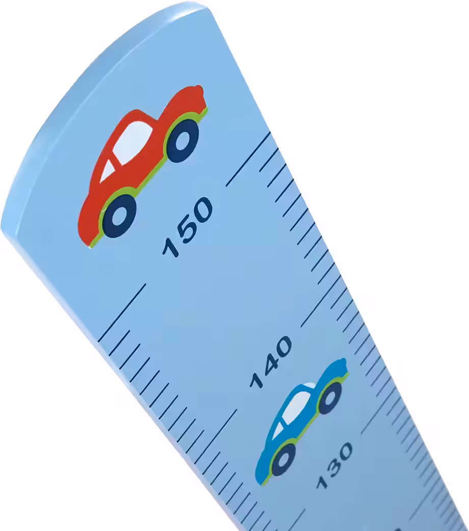 The MDF-made bar with blue paintwork and sleek car motifs can be easily attached to the wall by the recess processed on the back. The measuring scale of the bar starts at 70 cm and reaches up to 150 cm. In combination with many other articles in the series ‘Racers’, the children’s room can be decorated nicely uniform for small car lovers.