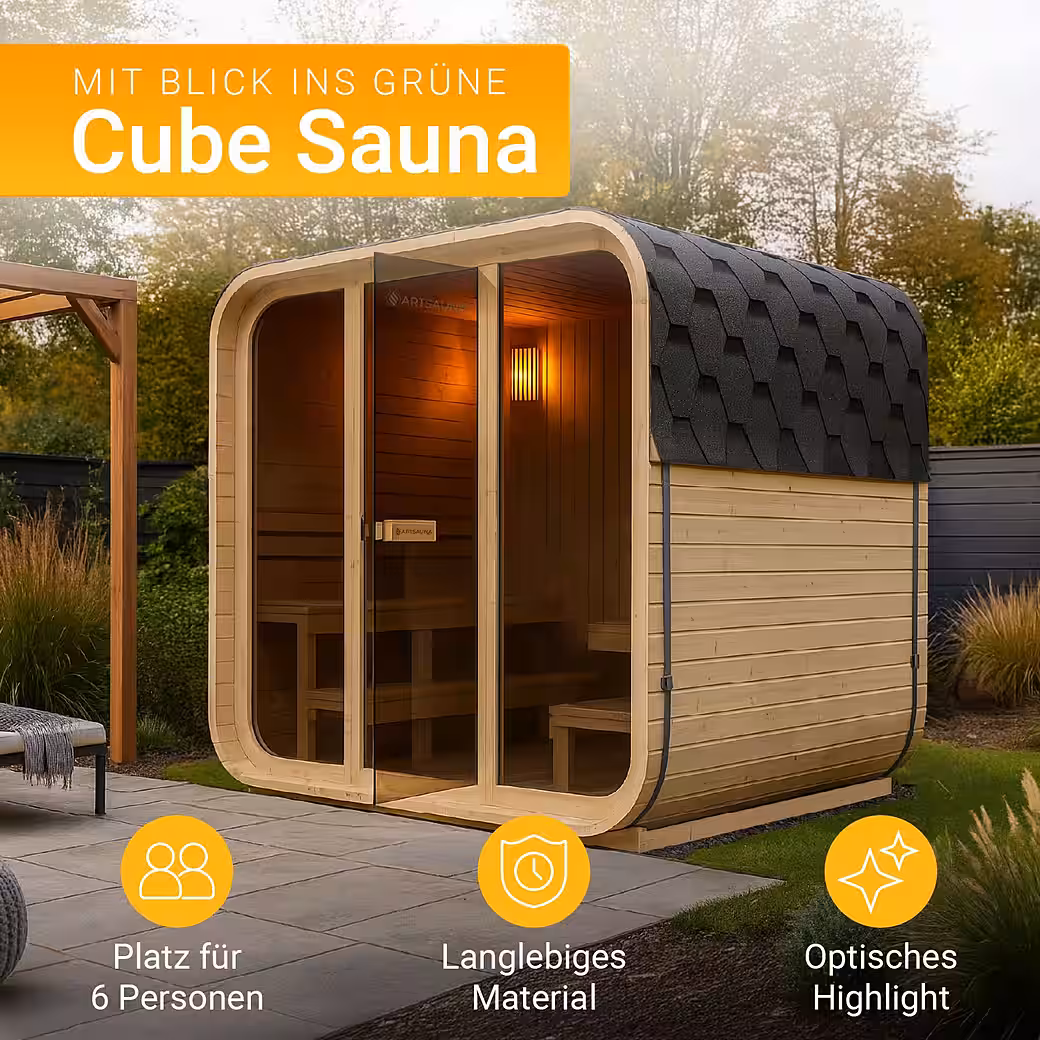 Want to regularly pamper yourself without appointments or travel? The Cube Fjora barrel sauna brings a true spa experience to your garden. The 9 kW sauna heater reliably heats the garden sauna to up to 100°C – ideal for relaxation, recovery after sports, or stress relief, even in winter. Inside, you’ll find natural spruce wood, benches for up to 6 people, and a large panoramic window offering an unobstructed view of the outdoors. This outdoor sauna combines modern design with traditional sauna comfort – thoughtfully designed, weatherproof thanks to robust roof shingles, and equipped with accessories such as a thermometer, hourglass, and sauna bucket. Whether you’re looking for a complete set or specifically a winter-proof wooden sauna, Fjora offers everything you need for relaxing breaks in your own garden.