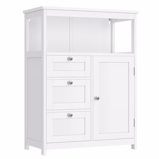 - Surface and open compartment for frequently used items, 3 drawers for small items and 3-stage height-adjustable shelf behind the cabinet door
