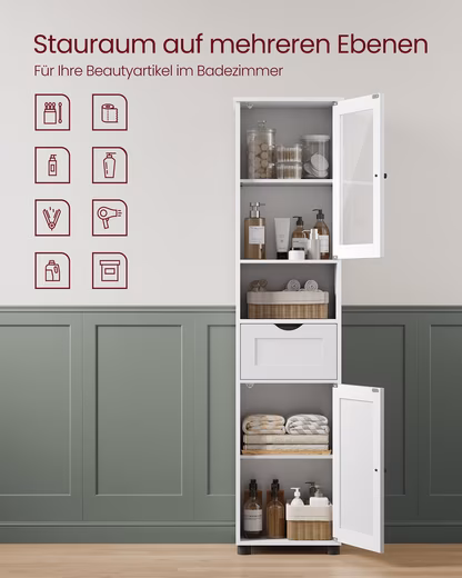 - Elegance: White surface with wood grain, stylish glass door – this tall cabinet gives your bathroom a pleasantly fresh and elegant touch.