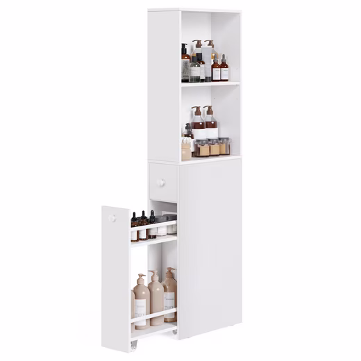 - This narrow bathroom cabinet maximizes storage space in your home. It fits perfectly into small corners of your bathroom, for example, between the wall and the toilet.
