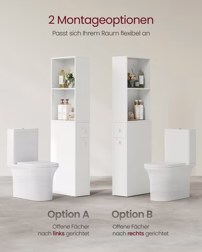 - The upper part of the bathroom cabinet can be mounted to face left or right, thus adapting flexibly to your room.