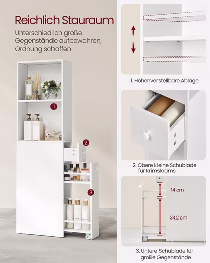 - Made from high-quality MDF, this narrow bathroom cabinet is robust and stable, providing secure support for your belongings. The included anti-tip device ensures stability.