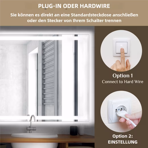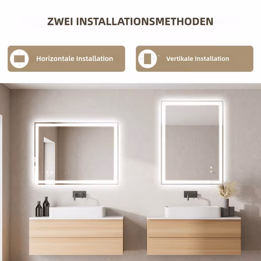 It supports both horizontal and vertical installation methods, and works with the French V-shaped hanging rod design to ensure that the mirror hangs stably on the wall while keeping beauty and safety in mind. No matter how your bathroom space is designed, you can find the most suitable installation method. In addition, two power access methods are available, hardwired and socket, to flexibly adapt to the needs of different scenarios.