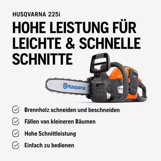 - Husqvarna 225i cordless chainsaw (excluding 36V battery and charger) – Lightweight, cordless, quiet, 12″ bar, 20 m/s chain speed, ideal for tree pruning and garden maintenance