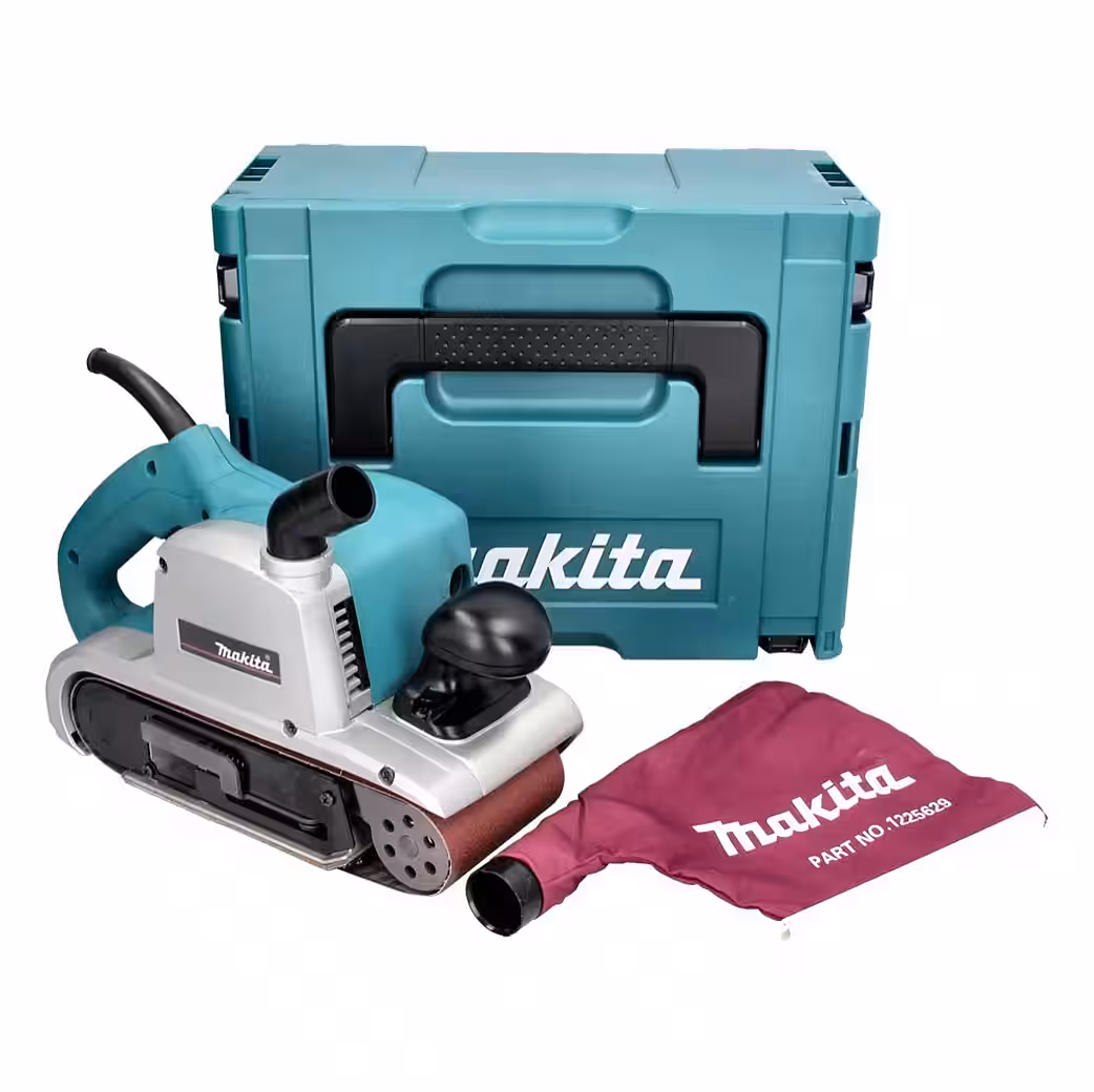 The Makita 9403 belt sander is a powerful belt sander that delivers high material removal rates thanks to its 1200-watt motor. It offers excellent balance and an ergonomically shaped handle that helps prevent fatigue. The ball bearings are very effectively protected against dust thanks to labyrinth seals. It is compatible with 100 mm wide sanding belts. The machine achieves a belt speed of 500 m/min. Dust extraction is very efficient thanks to the 360° rotating dust bag. Makita is a leading global manufacturer of power tools. A long tradition and the 18-volt LXT battery system, with over 360 compatible tools, distinguish the company.