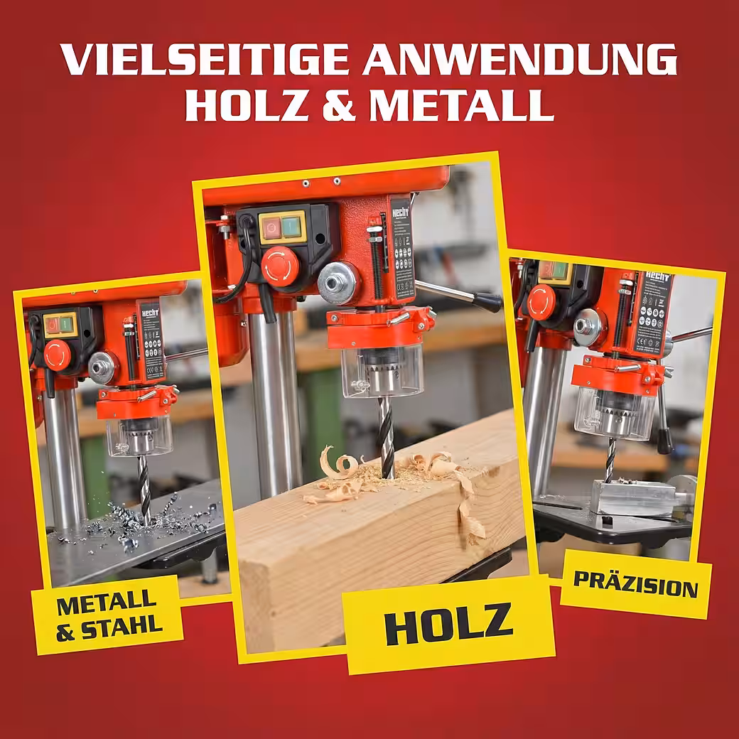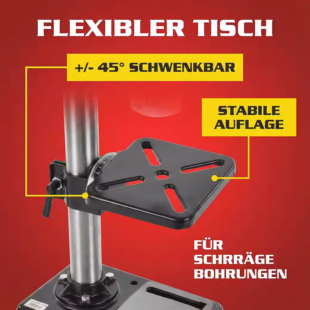 - ROBUST DRILLING TABLE – Tilting worktable +/- 45° for precise angled drilling. Stable construction for high precision and secure workpiece guidance.