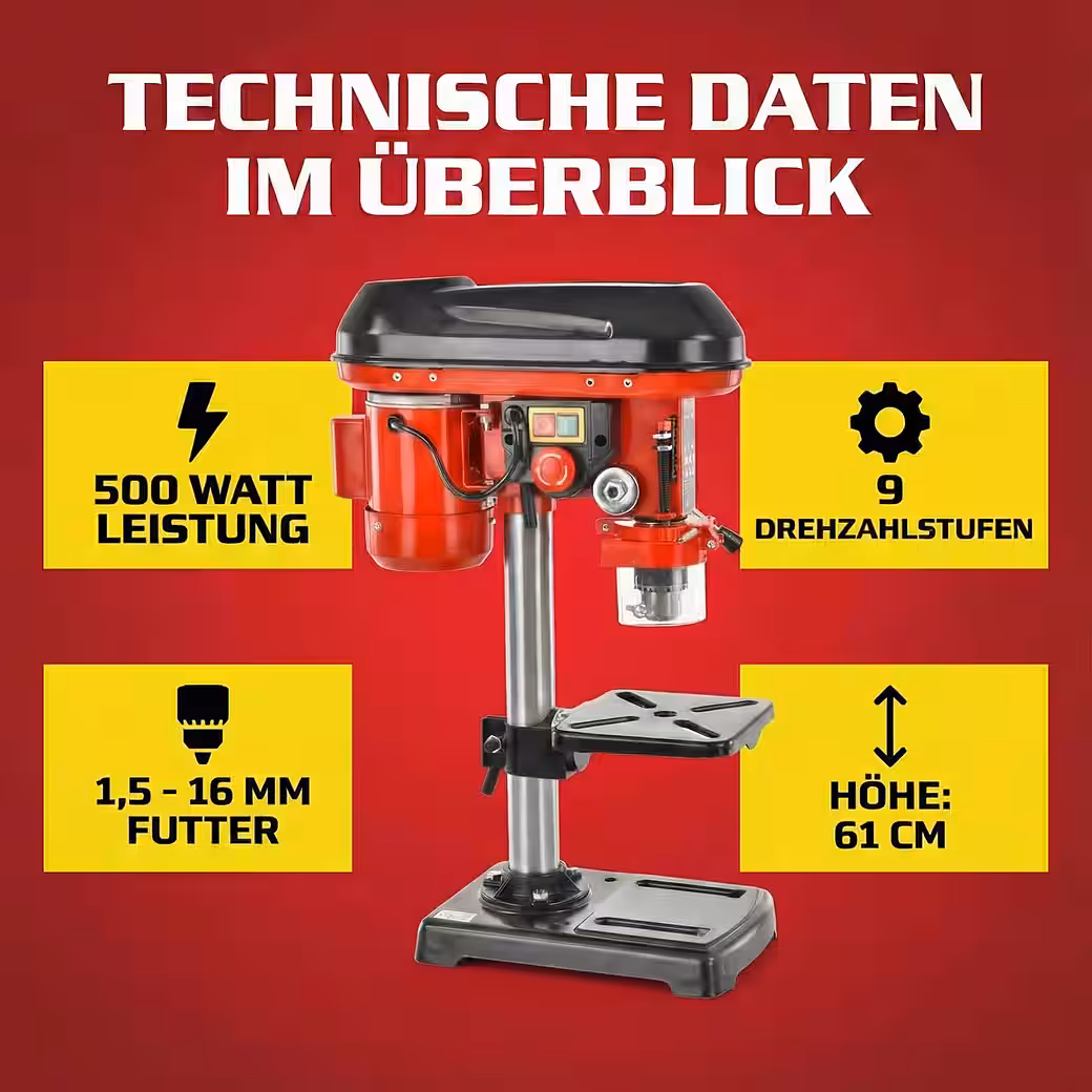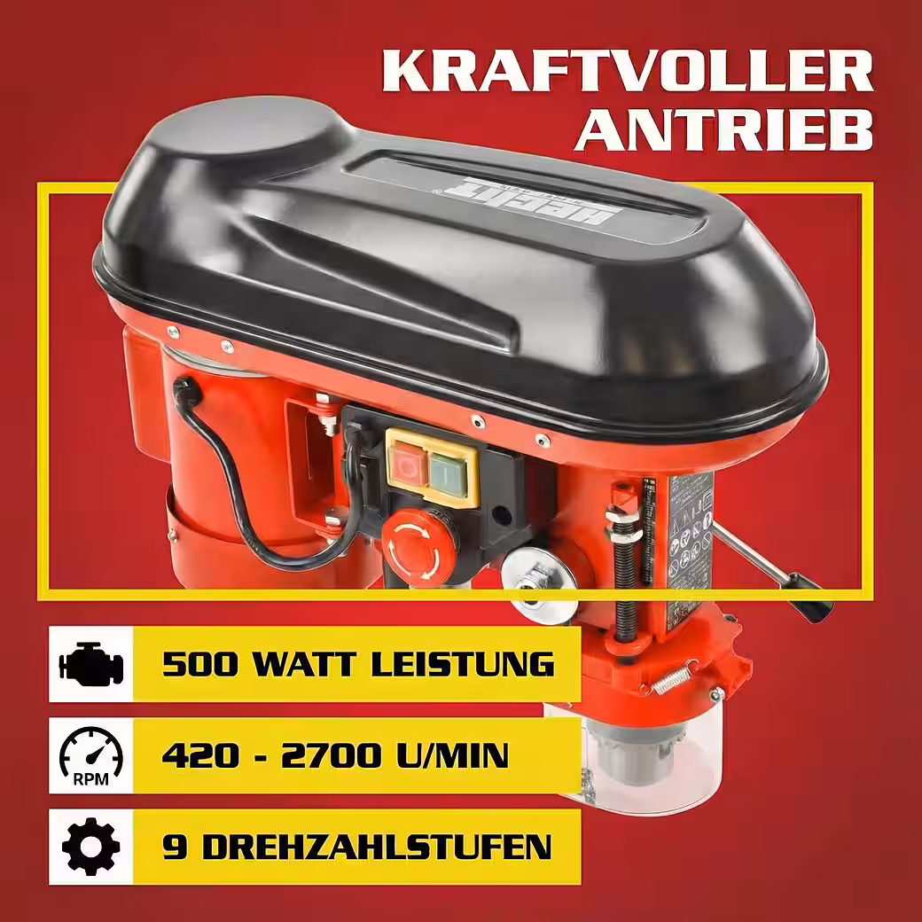 - 500-watt motor – Powerful electric motor for clean and precise drilling in wood, metal, and plastic. High speed ensures efficient and consistent results.