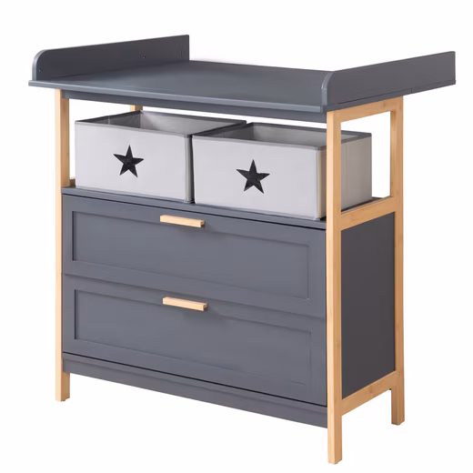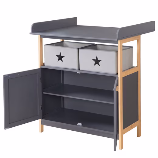 - STYLISH DESIGN: Modern anthracite look with contrasting wooden handles and bamboo feet – 2 doors, 2 fabric boxes, 1 open compartment – Ergonomic changing height: 92cm