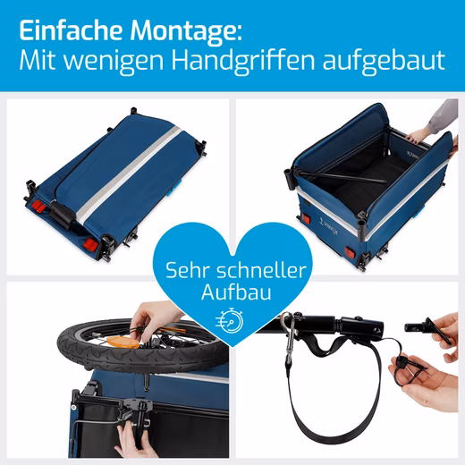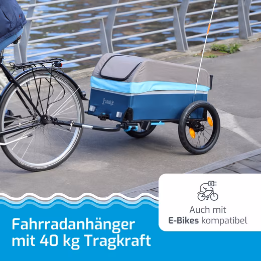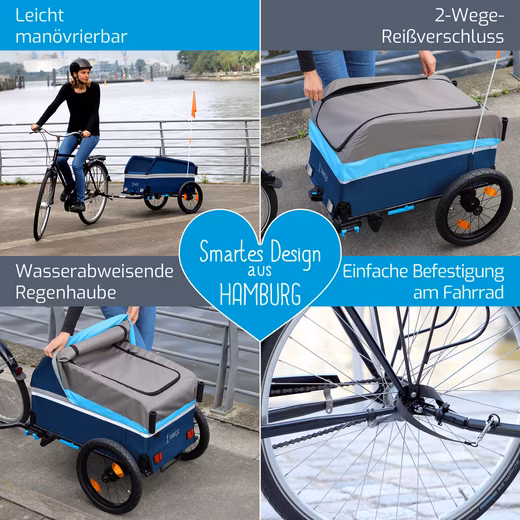 Discover the versatile 2-in-1 bicycle trailer that can also be used as a handcart. With just three simple steps, the trailer can be easily assembled and converted, offering maximum flexibility for your everyday life. Thanks to the innovative quick-release system, the trailer is set up in seconds. No complicated assembly required – simply unfold and you’re ready to go! The trailer is extremely robust and weatherproof. The high-quality rain cover with a double-sided zipper reliably protects your cargo from the elements. Road safety is paramount: The trailer is equipped with reflectors on the tires and body, as well as a reflective strip all around, ensuring high visibility in traffic. The parking brake prevents unintentional rolling and provides additional security. The trailer is compatible with city bikes and e-bikes up to 25 km/h, offering flexible usage options. The thoughtful design allows for easy handling: The height-adjustable handle and the 180° swivel front wheel ensure effortless steering. The trailer offers ample space for two standard beverage crates and can carry up to 40 kg. The load can be secured using tie-down straps (not included). When not in use, the trailer folds flat and fits easily into small cars. This makes it space-saving and ideal for households with limited storage space. Designed in Hamburg, the trailer impresses with its durable and high-quality construction. Perfect for shopping, packages, dog food, and much more – this 2-in-1 bicycle trailer makes your everyday life easier and more convenient without a car.
