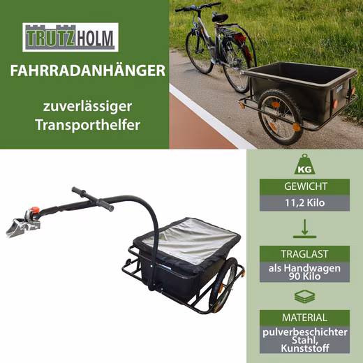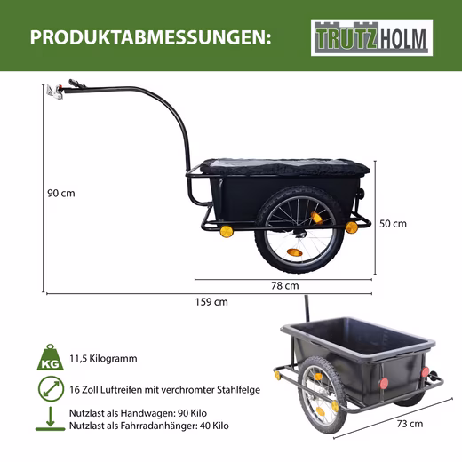 - Payload as a handcart: approx. 90 kg, payload as a bicycle trailer: approx. 40 kg