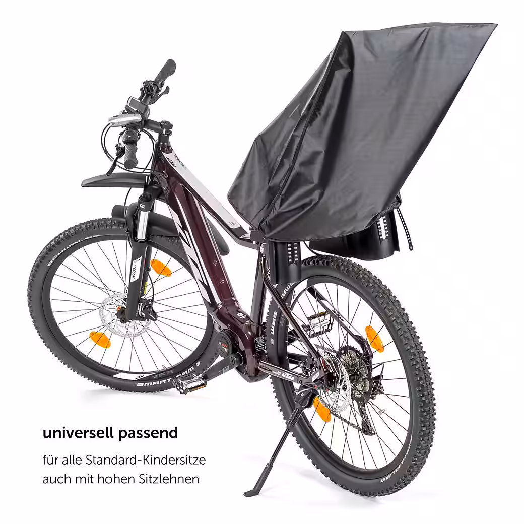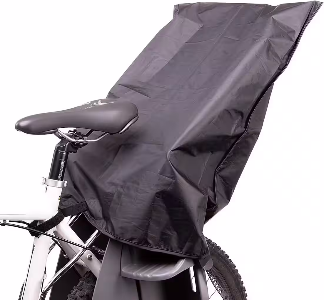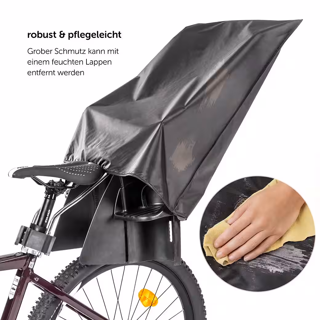 But the cover doesn’t just protect against rain and stains outdoors; it also keeps dust and dirt out in the basement. The rain cover fits most standard rear-mounted child seats – whether with or without a luggage rack. It attaches to the frame or seat post with Velcro straps, ensuring it stays securely on the bike. After use, you can simply remove it, fold it up small, and store it away to save space.