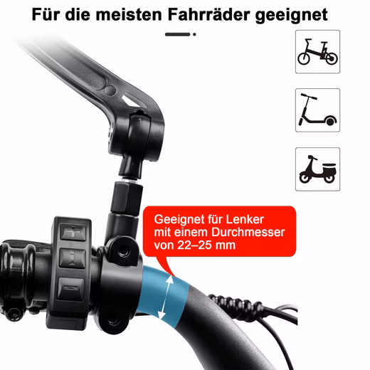 Bicycle mirror for 21-25 mm handlebars, suitable for most other models of mountain bikes, e-bikes, folding bikes, electric scooters and motorcycles.