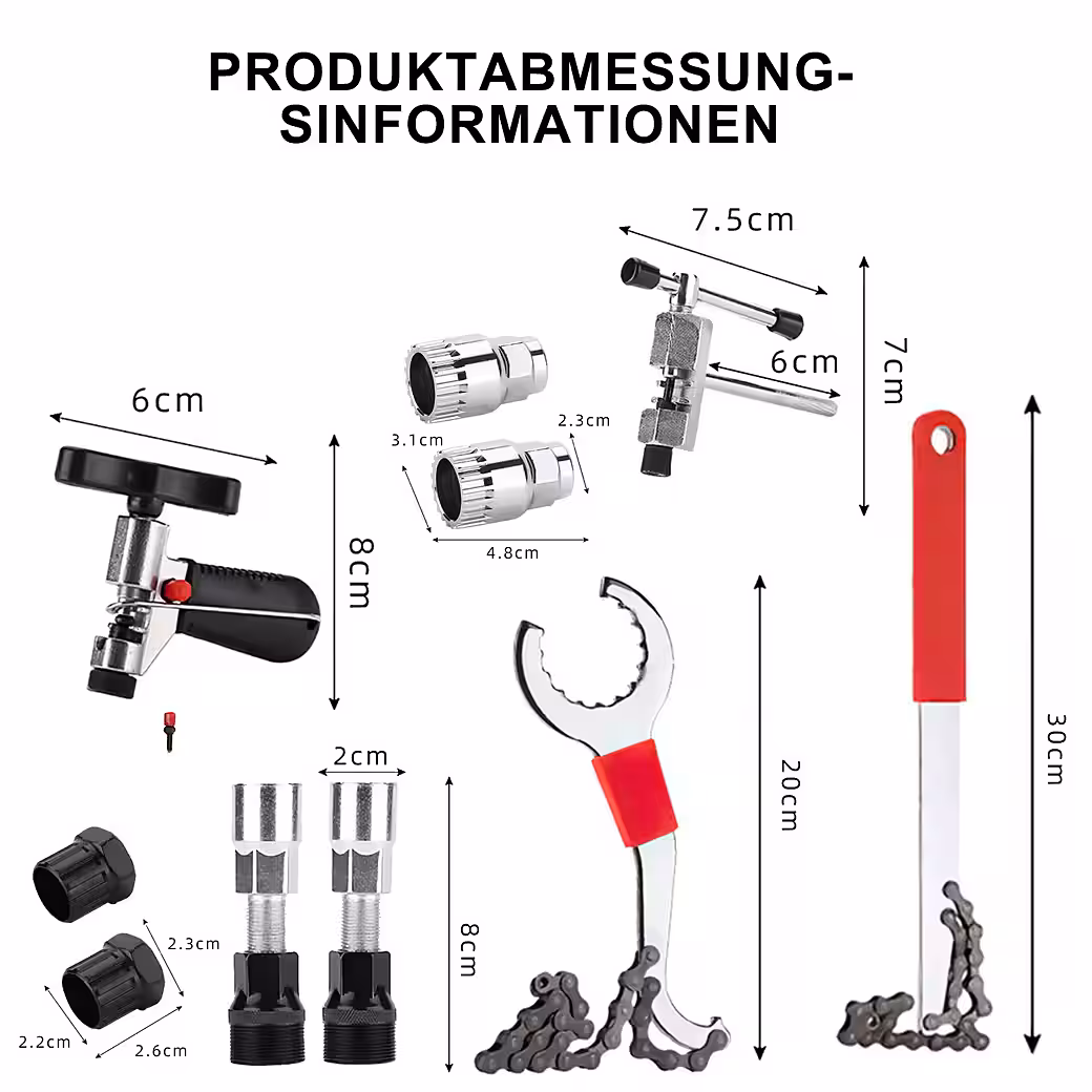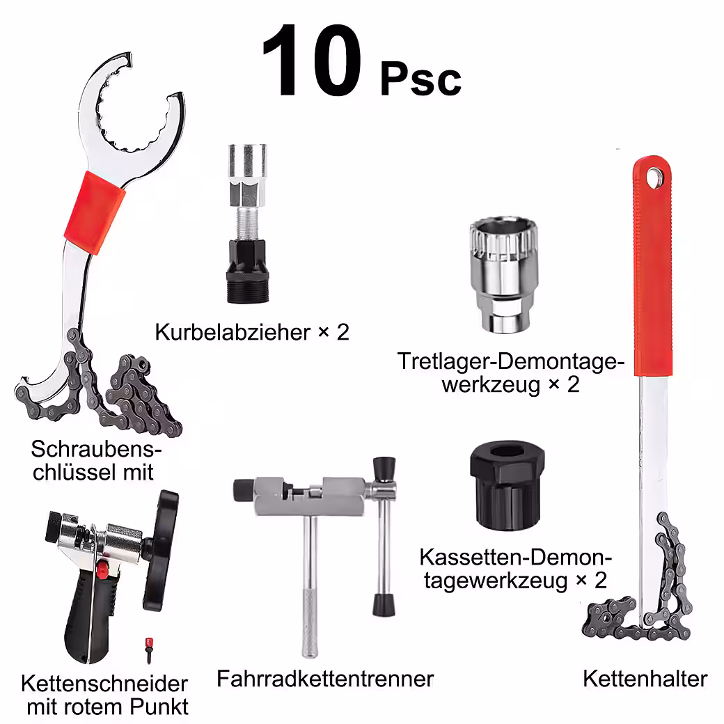 This 10-piece set includes a chain hook, chain tool, chain fixer, bottom bracket wrench, cassette remover, and crank puller – for all essential repair and maintenance work on the chain, cassette, bottom bracket, and crank. Ideal for home workshops, bike tours, or professional use.