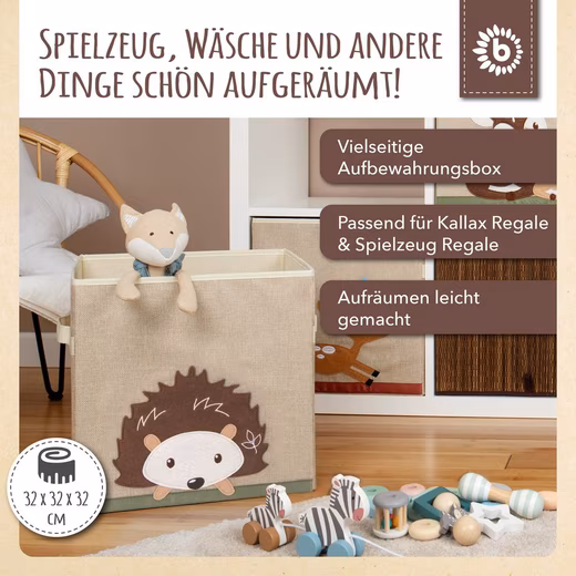 This lovely children’s storage box from Bieco brings order to any child’s room. Featuring a cute hedgehog design, the storage box brightens up any child’s room and brings joy to both children and parents. The decorative box is square and can easily be used as a Kallax storage box. When not in use, it can be folded flat for space-saving storage in a cupboard.