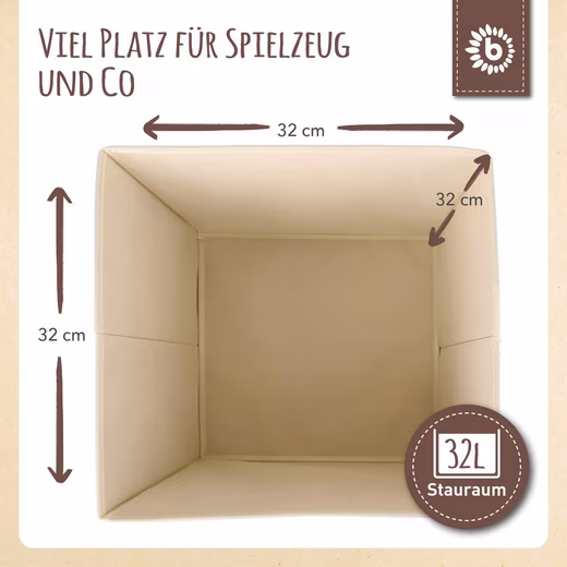 Thanks to the carrying handles on the side, the baby box is incredibly easy to transport. Measuring approximately 33 x 33 x 33 cm, this compact storage box has a capacity of about 36 liters. Made of durable polyester, this children’s storage basket is particularly easy to clean. Discover our other storage boxes with lids for the nursery in matching designs.