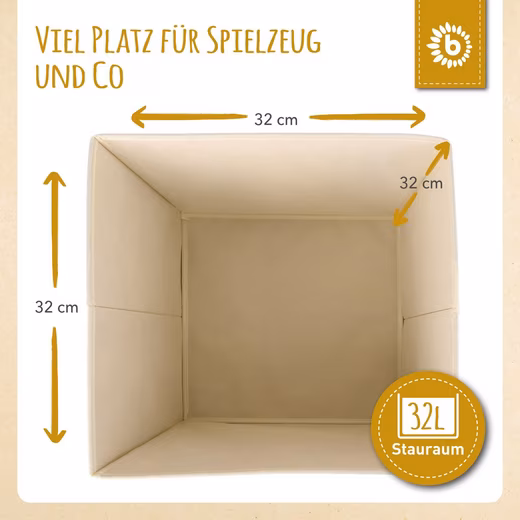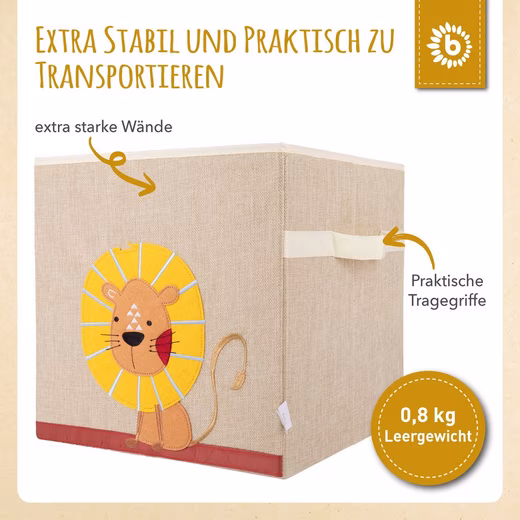 Scope of delivery: 1x storage box, beige. Design: Lion. Dimensions approx. 33x33x33 cm; Material: Polyester; Capacity approx. 36 liters. Item weight approx. 875g; Boxes for Kallax shelving unit