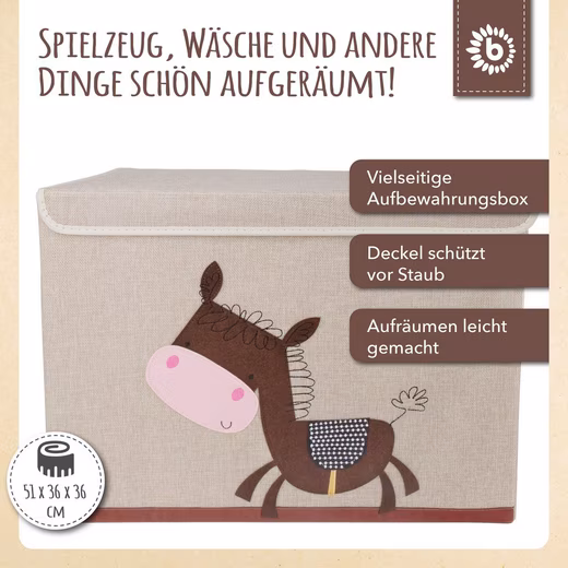 • Scope of delivery: 1x storage box, beige. Design: Donkey. Dimensions approx. 36x36x51 cm; Material: Polyester; Capacity approx. 65 liters. Item weight approx. 1.65 kg.