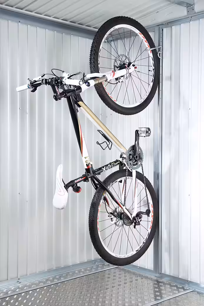 With the bikeMax bicycle rack, you can store your bicycles up to 26 inches in size in your Biohort metal garden shed, saving space. Due to the height of the shed, you can only store children’s bicycles up to 24 inches. The hanging hook is also adjustable to six different heights. Furthermore, a locking eyelet for bicycle locks is already integrated.
