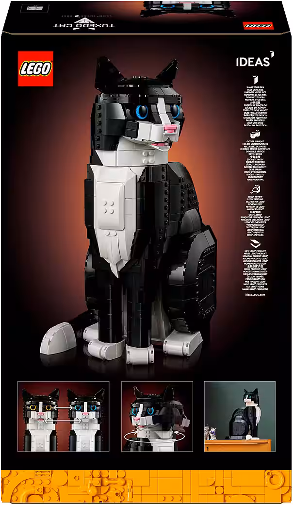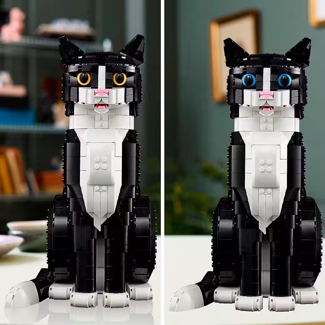 The LEGO Ideas Black and White Cat (21349) is a fascinating building set for adults that lets you create a great home decor piece. This toy model of a black and white cat makes a cool gift for anyone who loves cats, nature, and design. Build this lifelike, hypoallergenic cat figure with yellow or blue eyes. You can display the animal figure with its mouth open or closed, turn its head, and pose its ears, paws, and tail in playful ways.