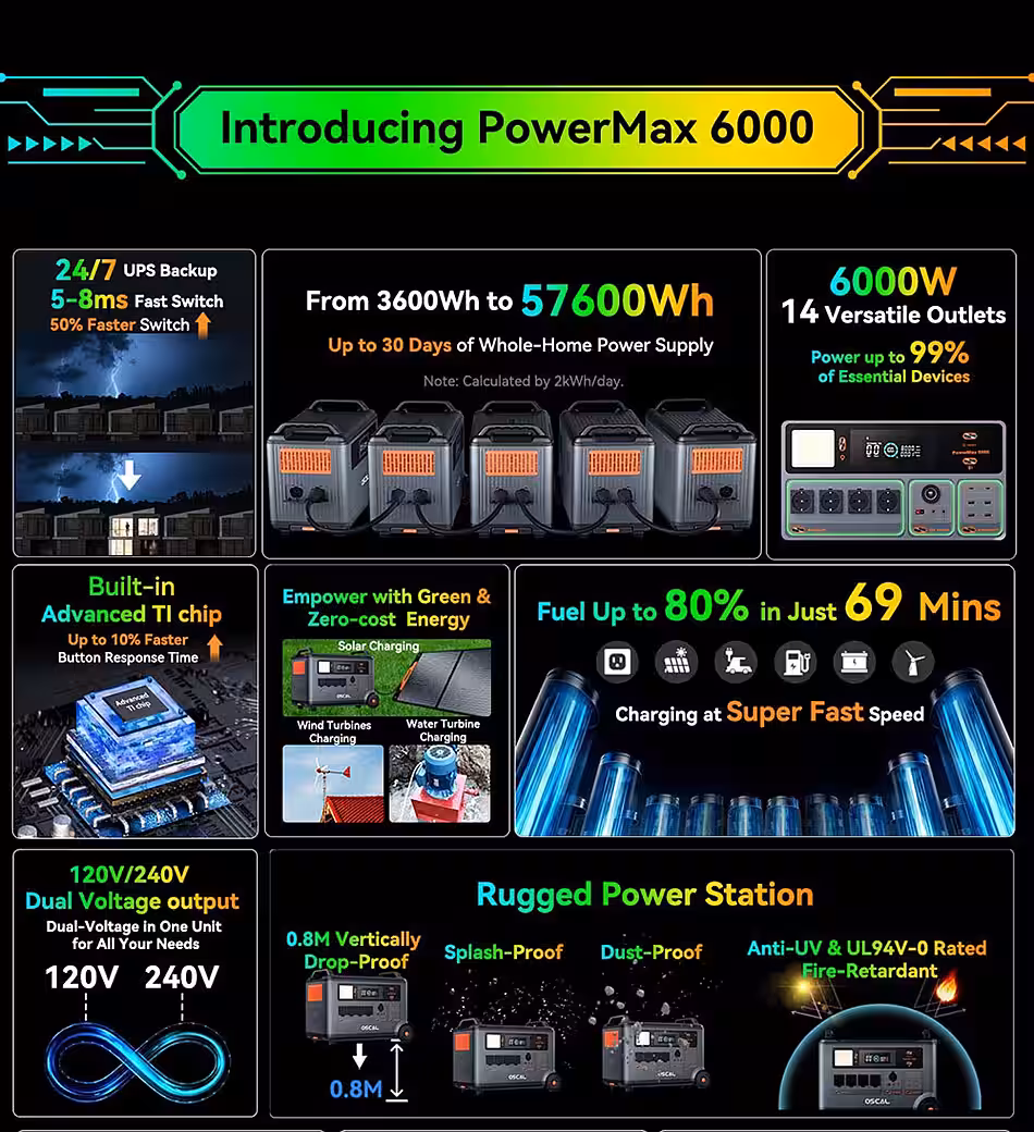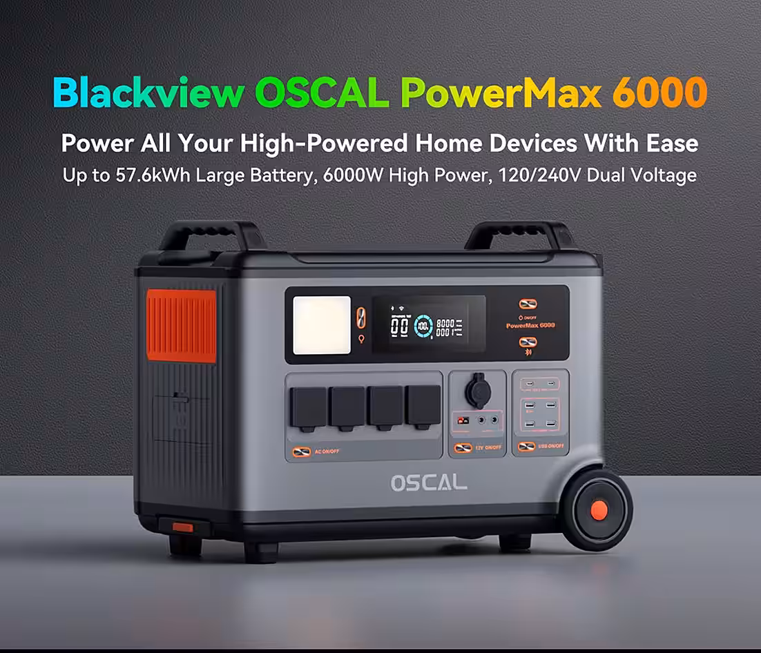 The PowerMax 6000 supports a total output power of 6,000W via four AC output ports, as well as 2x PD 100W USB Type-C, 3x PD 18W USB Type-A, 1x PD 12W USB Type-A, and a 120W cigarette lighter socket. It also features 1x 12V/25A (Anderson 378W output) and 2x 12V/3A DC5521 (5.5mm output) DC outputs.