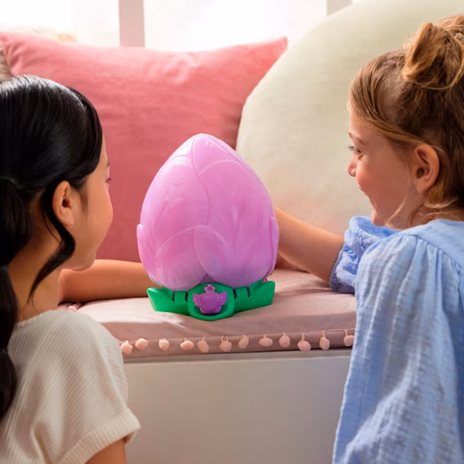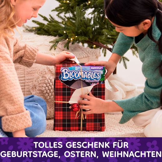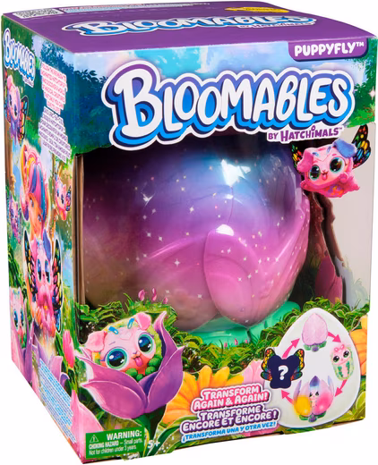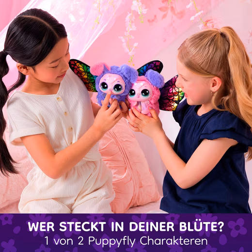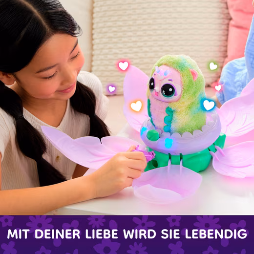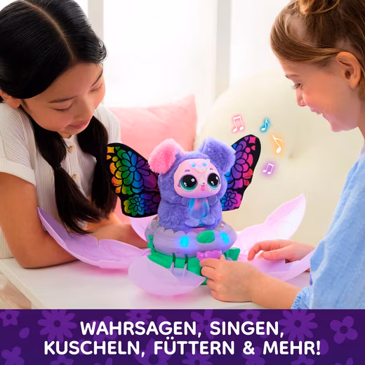 Now things get magical: with the Bloomables, the magical creatures from Hatchtopia. It all starts with a blossom. Water it, and magical lights appear, sounds fill the air, and the flower opens. A sweet Hatchipillar emerges, lovingly nurtured: playing, feeding, tickling, or cuddling. Once ready, it transforms into one of two Puppyflies – which one remains a surprise. Will it be Blossom in pink or Daisy in soft purple? Both look incredibly cute, are made of soft plush, and have brightly glittering rainbow wings. There’s never a dull moment with either of them: with over 100 sounds and reactions, singing, playing music, or even fortune-telling, the play possibilities are endless. The blooming and transformation can be repeated as often as you like. Demo battery included. Requires 3 AA batteries.