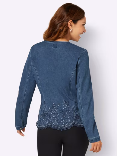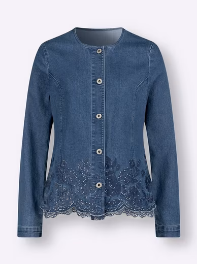 A great alternative to a blazer: this pleasantly soft denim blouse features attractive floral embroidery and rhinestones on the front and back curved hem. It features a round neck and full-length button placket. Shaping princess seams at the front and back. Sleeves with button cuffs. Supports the Cotton Made in Africa initiative.