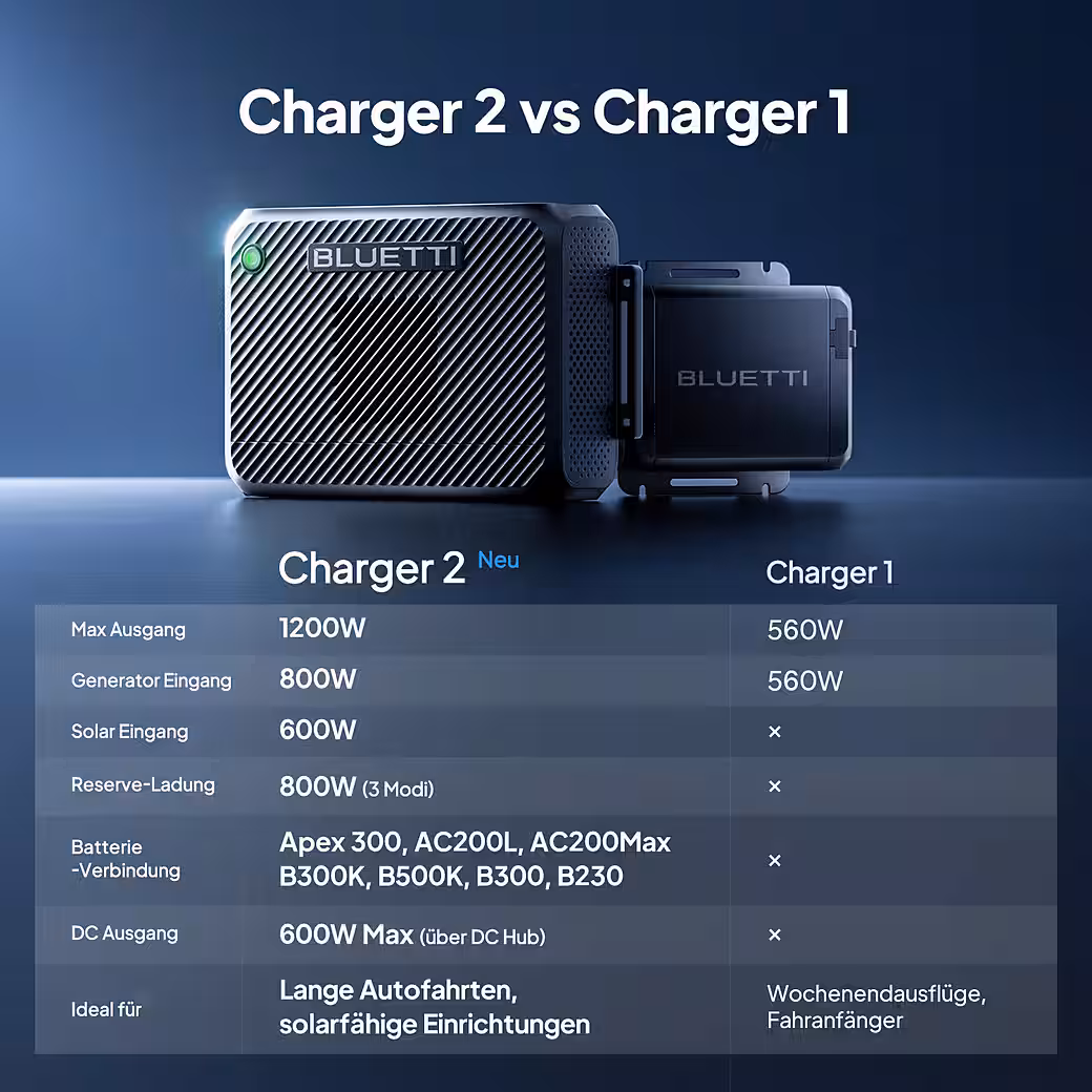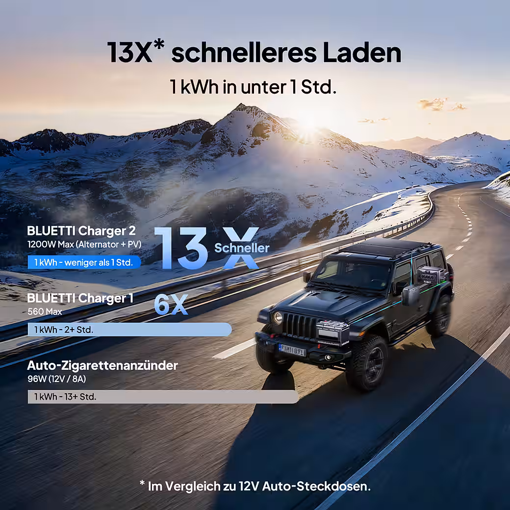 - BLUETTI Charger 2 (1,200 W max.)Â : <1 hour, 13 times faster