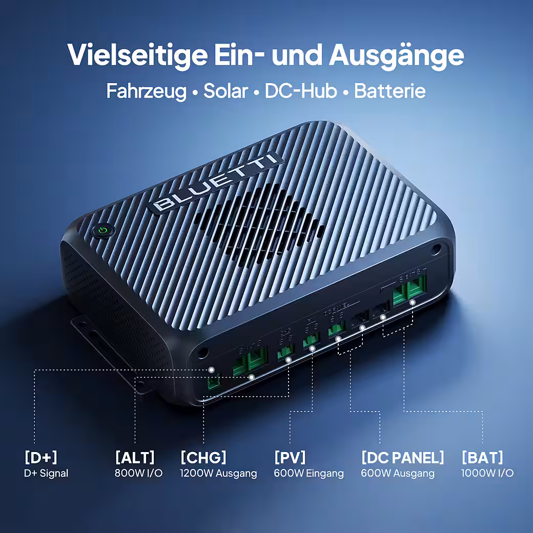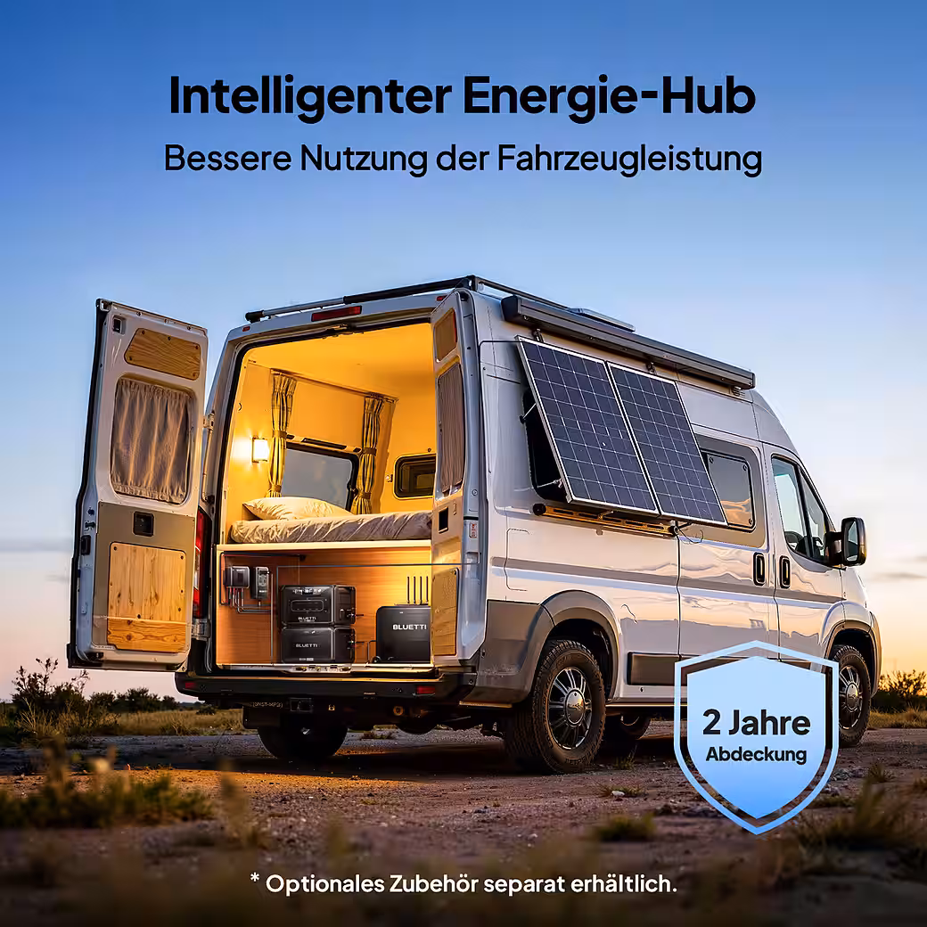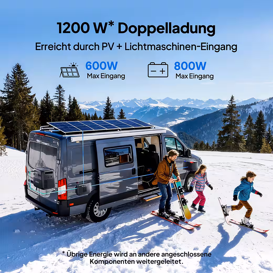 A2: The total charging power is limited to 1200W. Solar input always takes priority; the remainder is supplied by the vehicle’s starter battery and, if necessary, by the BLUETTI auxiliary battery for stationary operation.