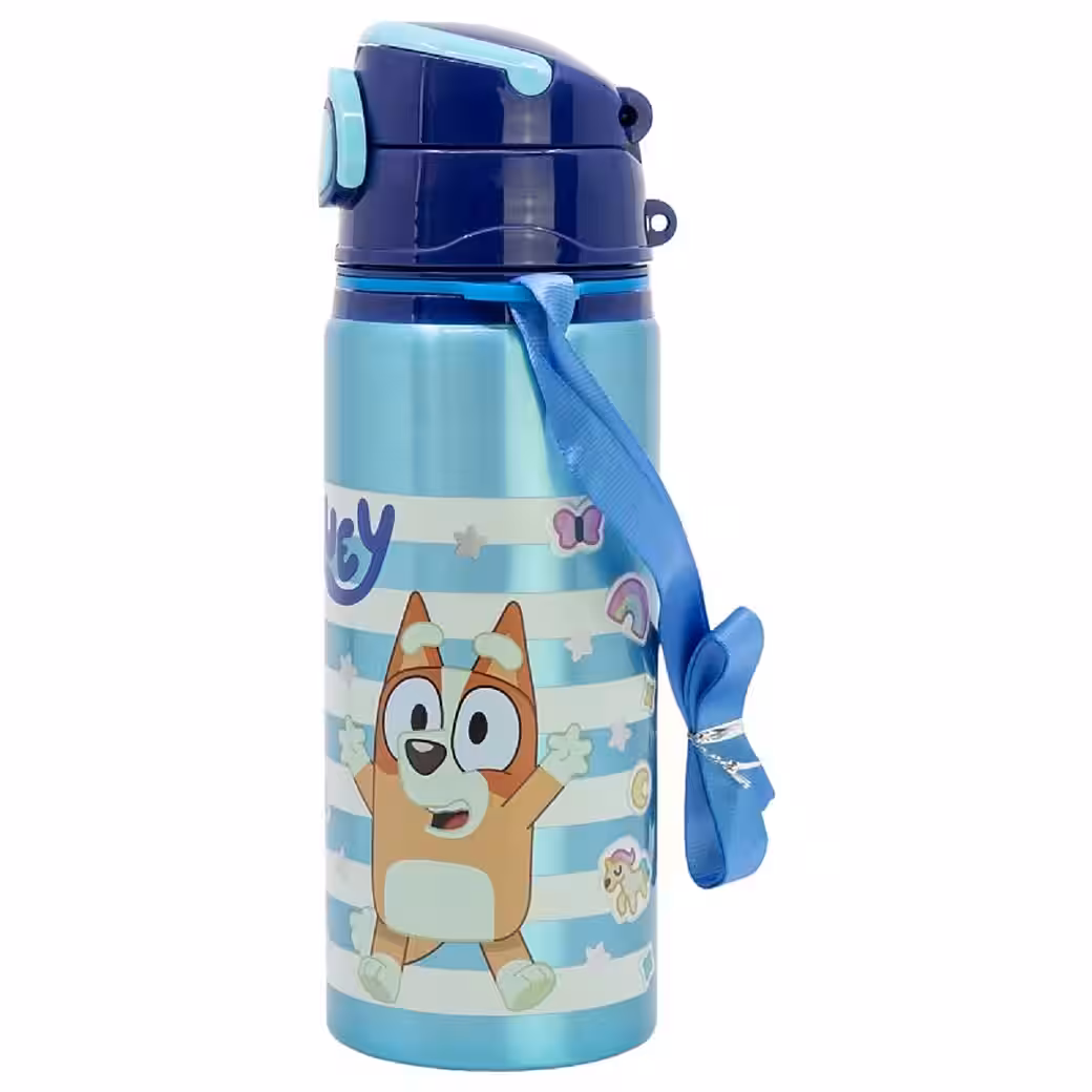 The Bluey aluminum water bottle with a 730 ml capacity is perfect for little adventures! With its practical push-button closure, children can easily open the bottle and drink without spills thanks to the integrated straw. The robust aluminum ensures durability, and the cool Bluey design makes the bottle the ideal companion for kindergarten, school, or outings. The adjustable carrying strap allows for easy transport and provides added comfort.