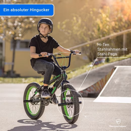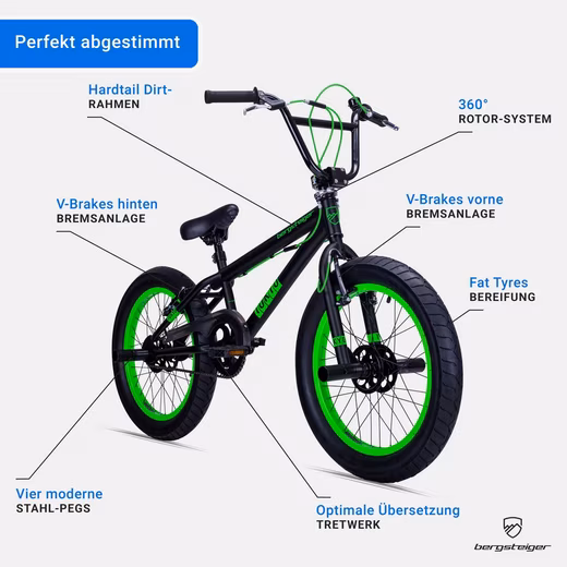The all-round BMX / fat bike for every day The 20 inch BMX Tokyo from the manufacturer Bergsteiger is a versatile all-rounder for every day. The bike’s removable chain guard provides additional safety on your tours. With this bike, you will always be a true focal point on the road. In addition to the cool and dynamic design of the bike, the Fat Tyres in particular are an absolute eye-catcher. Thanks to these extra thick tyres, you can not only enjoy maximum driving pleasure, but are also guaranteed to leave a lasting impression on your friends. The bike is almost completely assembled upon delivery and only needs a few minor steps to be ready for use. This means that you can start your first tour with this bike shortly after delivery. With a frame height of 29 cm and a Hi-Ten steel frame, this bike is ideal for people over 130 cm tall. The mountaineer Tokyo is not only the ideal vehicle for teenagers, but can also be used reliably in adulthood. Thanks to modern steel pegs, which are also included, you can give your movements even more expression. The integrated 360° rotor system in the handlebars also causes a sensation. This allows you to turn your handlebars freely 360° and prevents the Bowden cables from getting stuck. A high-quality V-brake is installed at both the front and rear. These provide the necessary delay even in heated situations. Mountaineers – bicycles that move.