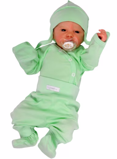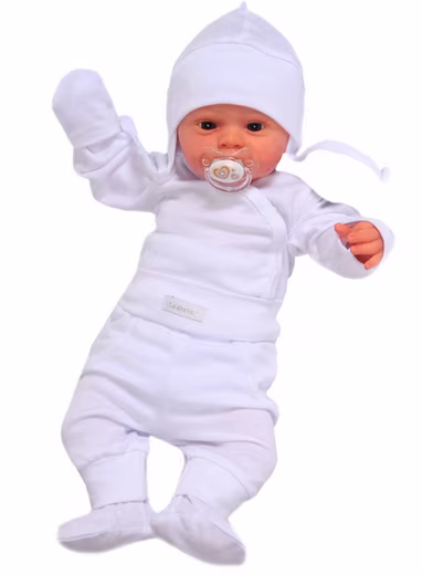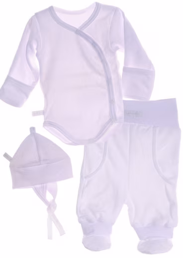 • Baby suit 3-piece wrap bodysuit with scratch protection, trousers with feet and wide waistband and hat to tie.