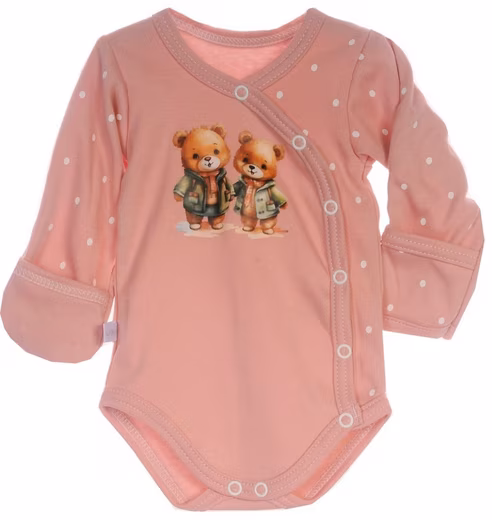 Wrap bodysuit with scratch protection and matching trousers – Perfect for your baby Discover our lovingly designed baby set consisting of a wrap bodysuit and matching trousers. The set combines comfort, style and functionality and is perfect for all seasons. Product details: Material: 100% pure, soft cotton – gentle on sensitive baby skin and pleasantly breathable. Wrap bodysuit: In old pink with cute polka dot design and cute bear print. Scratch protection: Integrated gloves protect your baby’s face. Extra Long Sleeves: Provide plenty of freedom of movement so that your baby can stretch out arms and hands comfortably. Wrap closure with press studs – easy to put on and take off. Matching Pants: With a soft, elastic waistband for optimal support and comfort. Feet keep your baby’s little toes warm and provide security. Sizes: This set is available in different sizes and is ideal for premature babies, newborns, babies and toddlers. A perfect gift: This baby set is not only practical, but also a wonderful gift idea for birth, Christmas or baby showers. The charming design in old pink with dots and the cute bear motif makes it a highlight in every baby’s wardrobe. Versatile and practical: The set is perfect for everyday wear, comfortable for the baby and easy to care for – an ideal choice for parents who value quality and functionality. Order this adorable wrap bodysuit and trouser set and give your baby or the parents around you a special treat!