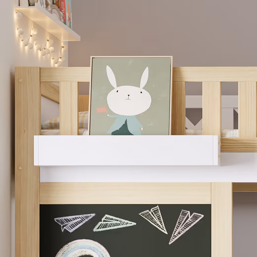 - A small chalkboard under the bed invites children to paint and create, while storage boxes next to the bed keep toys tidy.
