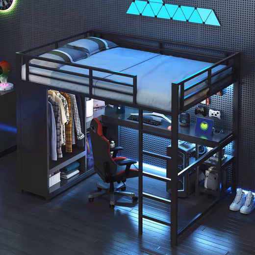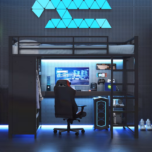 This Merax gaming loft bed (140×200 cm) is the perfect all-rounder for small rooms. The integrated desk with LED lighting and storage compartments creates an ideal work and gaming zone. The continuous railing ensures safety, while the open wardrobe offers additional storage space for clothes and accessories. The robust metal frame is durable and stable, supporting up to 150 kg. Thanks to its clever space-saving design, the room remains tidy and functional.Â