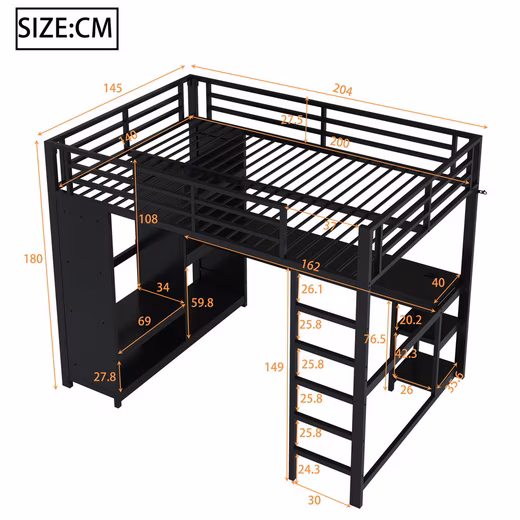 Features: Desk with LED lighting, open wardrobe, storage compartments, mattress not included
