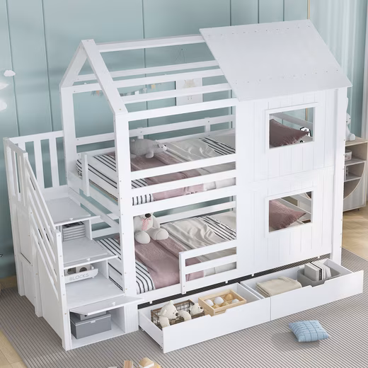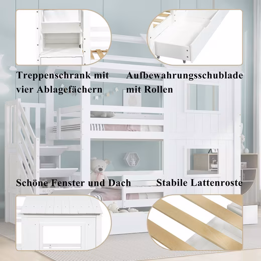 The staircase with practical storage compartments provides safe access to the upper bunk – each step becomes storage space for books, toys, or treasures.