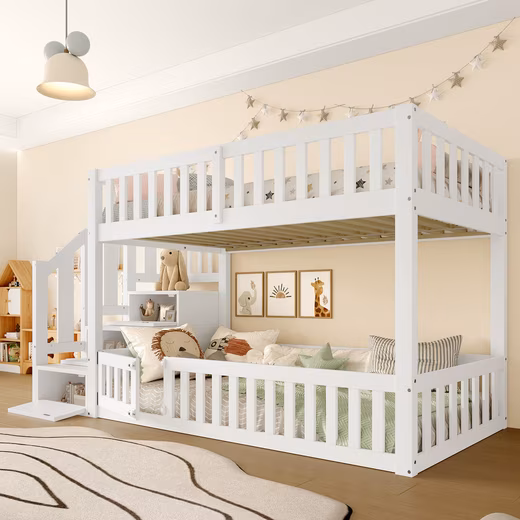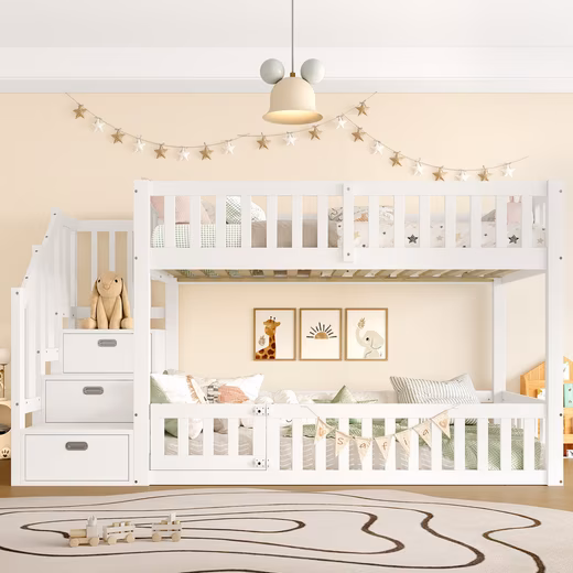 The low design protects against falls, while the small door on the lower bed and the stable construction ensure safe sleep and easy access for children.