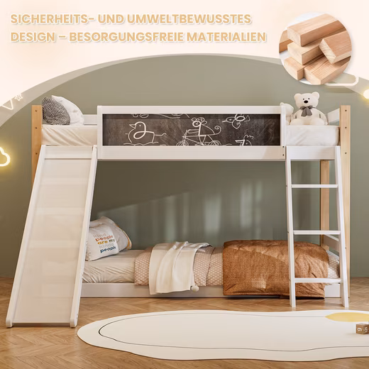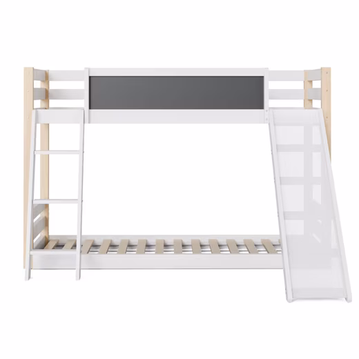 This white bunk bed features a slide and ladder that can be reversed from left to right. A 90x200cm mattress is recommended. The pine wood frame is sturdy and includes protective strips. The 747 safety system ensures a safe sleep. A chalkboard is included for creative freedom. The double-layered design saves space and is easy to assemble, making it ideal for smaller apartments.
