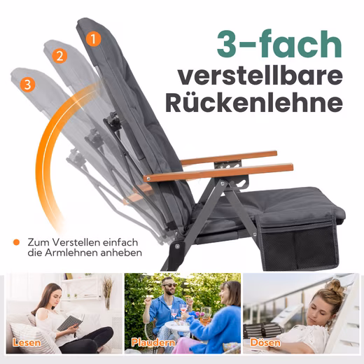 3-way adjustable backrest:Â Easily adjustable by lifting the armrest – from upright to reclined, as you would expect from a good high-back garden chair.