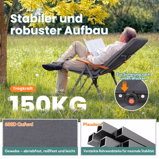 600D Oxford fabric:Â Tear-resistant, abrasion-resistant and weather-resistant – ideal for adventures with the folding camping chair.