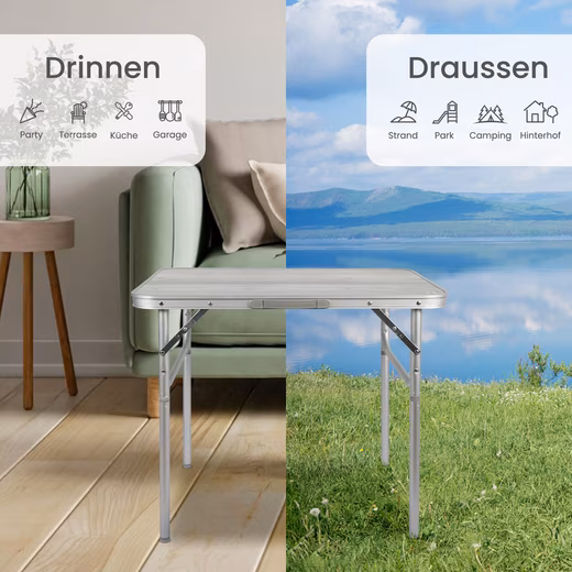 CAMPING TABLE: This ultra-light folding table made of aluminium is extremely weather-resistant and durable. It offers a generous storage area of about 75×55 cm (enough for 4 large plates), ideal for excursions and other outdoor activities. Thanks to its practical carrying function, it is easy to transport and neatly stow away. The versatile table is perfect for use in the home, garden and camping.